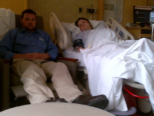 Thursday morning I woke up feeling uncomfortable. I had slept about 2 hours because Emma was busy moving back and forth across my ribs all night, and I just didn't feel right. I can't explain it other than that. I had a cramp in my side that felt like I had just sprinted a mile, and I couldn't shake it. I called my doc (again!) and she asked me to meet her at the ER, just in case. My husband was at work, so I called my mom and dad to come get me. I took a quick shower (I know, you're probably thinking that I'm crazy, but I have this fear of arriving at the hospital in dirty underwear), and by 11:15 I was waiting on the front doorstep of our apartment, in the rain (of course).